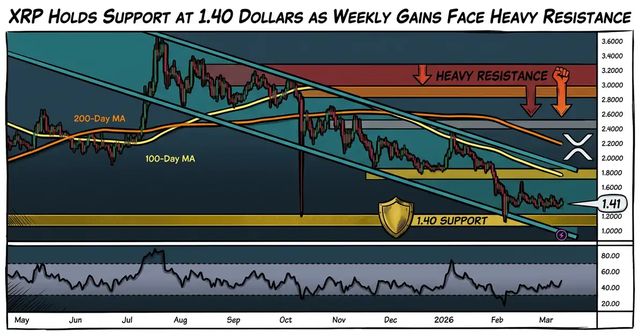 Despite the recent uptick, the daily chart for XRP/USDT shows the asset remains confined within a broad descending channel. The price is currently oscillating around the $1.41 mark, significantly below the 100-day and 200-day moving averages.